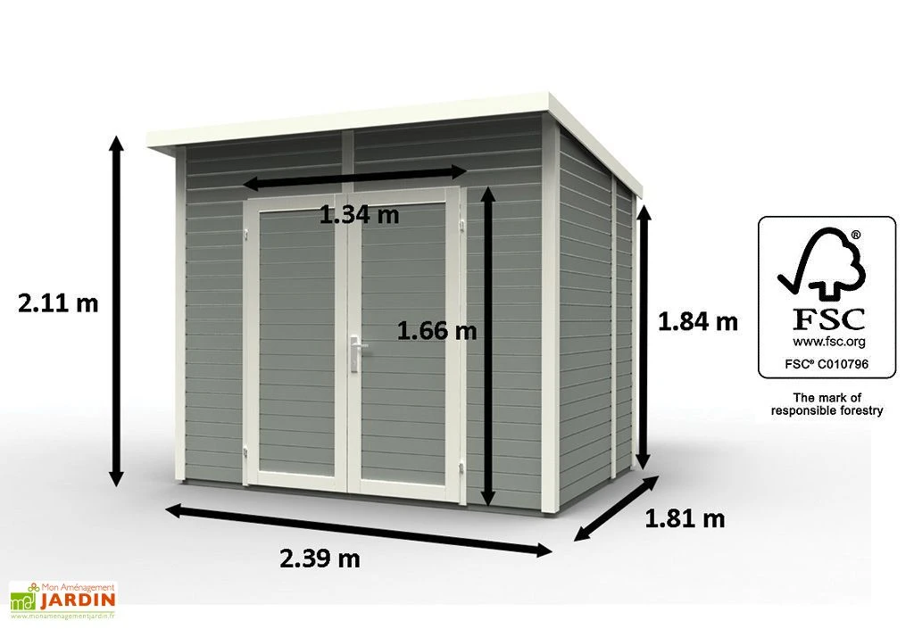 Votre abri de jardin en bois Skur 4 de chez Rowlinson est adossable. L’abri en sapin du nord FSC de 19 mm mesure 239 x 181 x 211 cm (l,l,h). Le toit en MFP et son feutre noir a une épaisseur de 12 mm, son inclinaison est de 5,6°. La pente peut être placée à l’avant ou à l’arrière. L’abri est livré avec son plancher, il existe dans deux coloris au choix : Gris Anthracite ou Gris clair (RAL 7001). La garantie est de 5 ans.