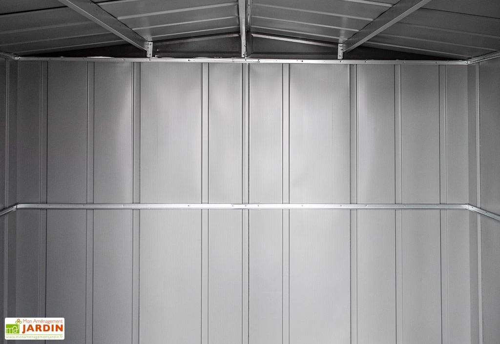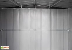 Cette remise de jardin est fabriquée en tôle d’acier galvanisé. Robuste et insensible à la rouille, l’acier galvanisé est un matériau qui se montrera également très résistant face aux intempéries, et ce sans exiger d’entretien particulier. Le cabanon de jardin est de plus équipé d’une double porte coulissante de 81 x 152 cm qui vous permettra de pénétrer aisément à l’intérieur afin d’organiser votre espace de rangement plus facilement.