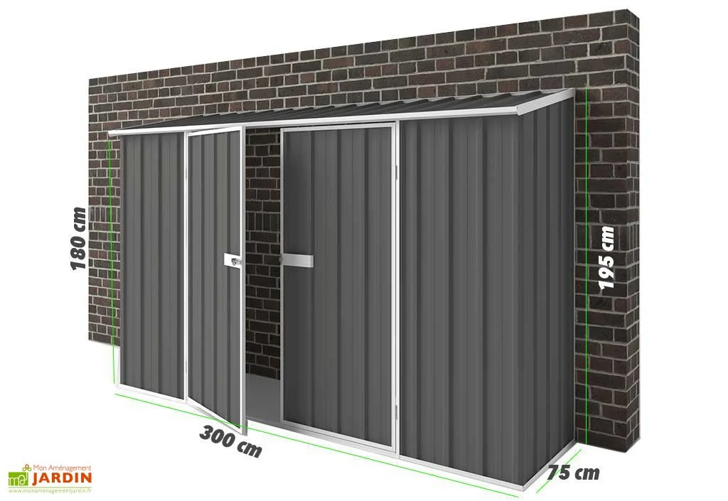 L’abri de jardin en métal mesure 75 cm de profondeur, 300 cm de largeur, 180 cm de hauteur à l’avant et 195 cm de hauteur à l’arrière. Il possède des parois en métal de 0,35 mm d’épaisseur recouvertes de 5 couches de peinture colorbond RAL 7015 – Gris Ardoise. Ses parois épaisses et la peinture garantissent une excellente résistance à la corrosion.