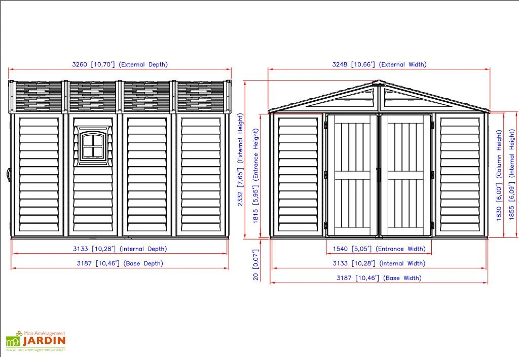 L’abri de jardin en PVC Duramax complète la gamme Woodstyle Premium. Il s’agit du modèle 10 x 10 qui mesure 3,26 m de profondeur, 3,25 m de largeur et 2,33 m de hauteur (dimensions hors tout). Il offre une surface utile de près de 10 m² grâce à ses dimensions intérieures de 3,13 x 3,13 m. Sa grande hauteur vous permet une utilisation confortable puisque vous n’avez pas à vous baisser lorsque vous êtes à l’intérieur.