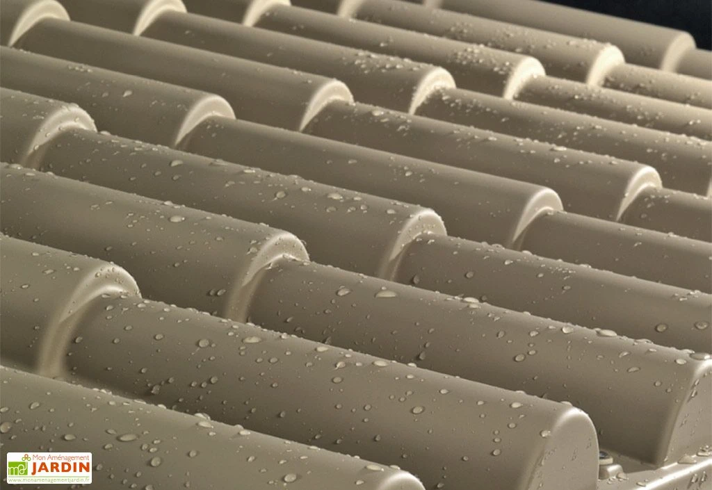 L’abri de jardin Garofalo Evo 280 est conçu en PVC et ABS, des matières plastiques résistantes aux chocs et qui ne demandent aucun entretien particulier puisqu’insensibles aux moisissures et autres insectes. Sa toiture imitation tuiles repose sur des profilés en métal galvanisé, donc résistants à la rouille. Cette couverture est traitée anti-UV, ce qui lui permet de ne pas décolorer au fil du temps.
