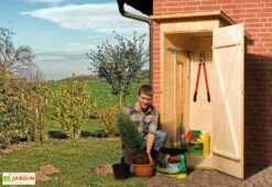 L’armoire de jardin est en bois brut, prêt à être traité et lasuré pour une bonne protection contre la moisissure, les insectes et le soleil. Les parois de l’abri mesurent 14 mm d’épaisseur. Il est équipé d’une porte simple battante avec une ouverture de 70 cm de largeur et 168 cm de hauteur.