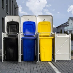 Ce modèle est prévu pour une utilisation en extérieur, il ne craint pas les intempéries et ne demande aucun entretien spécifique. Chaque compartiment est muni d’un portillon ouvrable sur la face avant et d’un couvercle avec crochet et cordelette pour une ouverture automatique de votre conteneur à déchets.