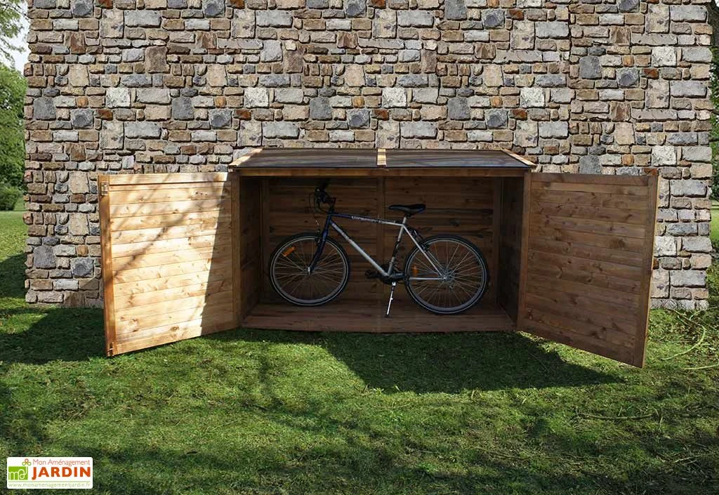 Le coffre de rangement en bois s’ouvre par le devant grâce à une double porte verrouillable (cadenas non fourni). Le plancher est inclus. La garantie est de 2 ans.