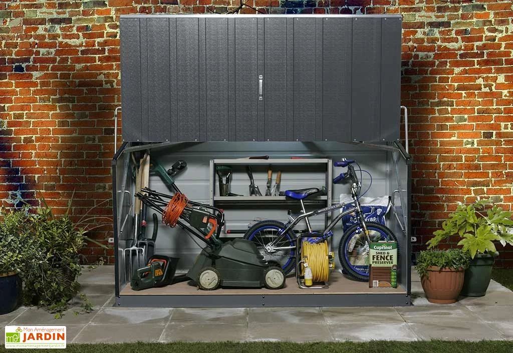 Le coffre de chez Trimetals mesure 89 cm de longueur, 196 cm de largeur et 113 cm de hauteur. Il est en acier galvanisé et ne demande aucun entretien puisqu’il est protégé contre la corrosion. Il peut s’installer près de la mer, il ne rouillera pas. Le coffre est également résistant au feu pour une protection maximale des objets stockés. Il dispose d’une porte qui s’ouvre et se ferme facilement, sans effort. Le coffre peut fermer à clé, grâce à des cadenas (non inclus). Vous pouvez fixer le coffre grâce à la quincaillerie fournie. La garantie est de 25 ans contre la corrosion.