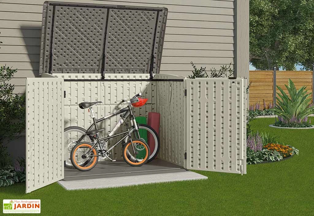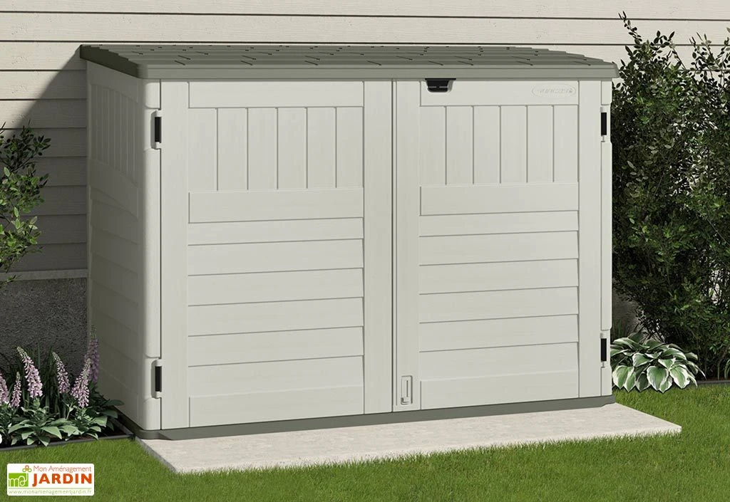 Le coffre de rangement Suncast Stowaway est en polyéthylène haute densité, un matériau résistant et qui ne demande aucun entretien. Le coffre mesure 1,12 m de profondeur, 1,79 m de largeur et 1,32 m de hauteur. Il est parfait pour le rangement de vélos d’enfants, pour cacher vos poubelles de ville ou pour stocker vos équipements de jardin. L’ouverture se fait par le haut et par la façade. Les dimensions intérieures sont de 166 x 98 x 125 cm (l,l,h). L’ouverture du couvercle est facilitée par 2 vérins à gaz.