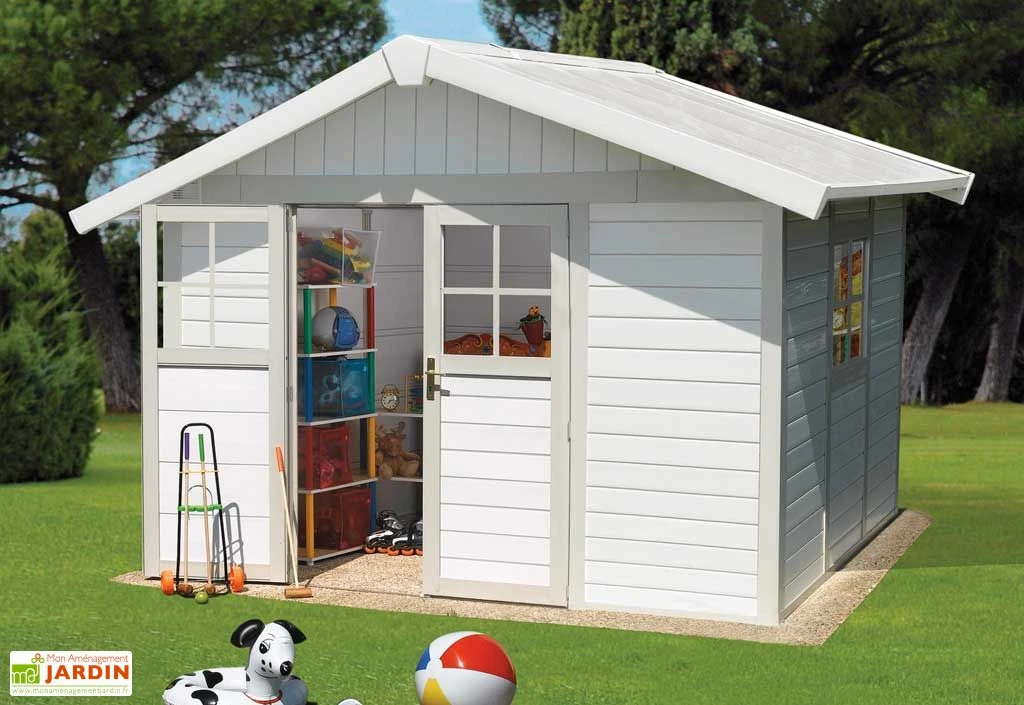 Votre abri de jardin PVC Déco 7,5 est de fabrication française. Il mesure 3,70 x 2,98 x 2,50 m (l,l,h) hors tout. Sa surface utile est de 7,04 m². L’armature de l’abri est en métal et les parois sont en PVC de 26 mm d’épaisseur. Le toit a une inclinaison de 20° et est en lames PVC menuisées de coloris gris vert.