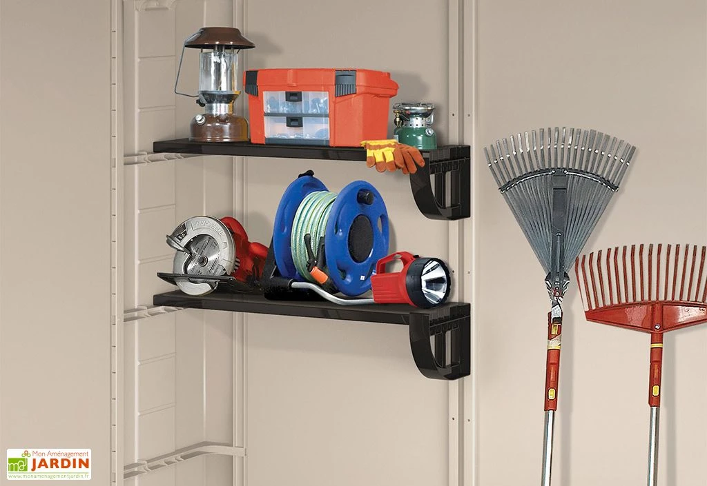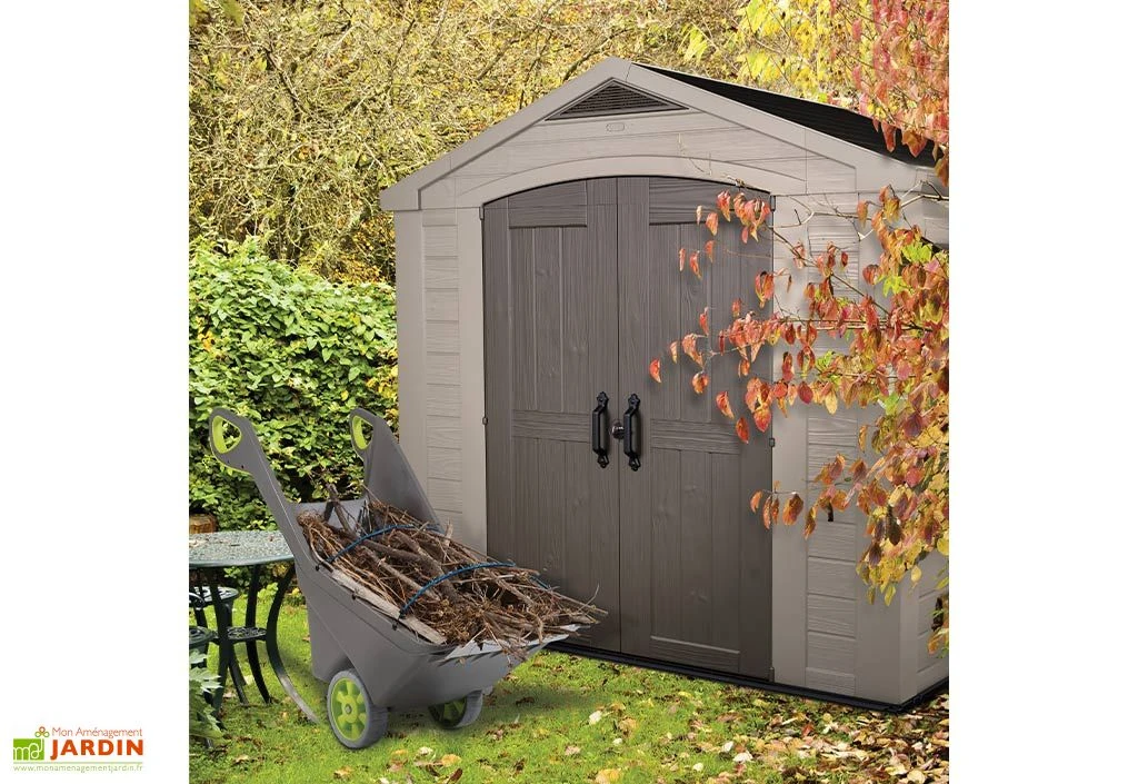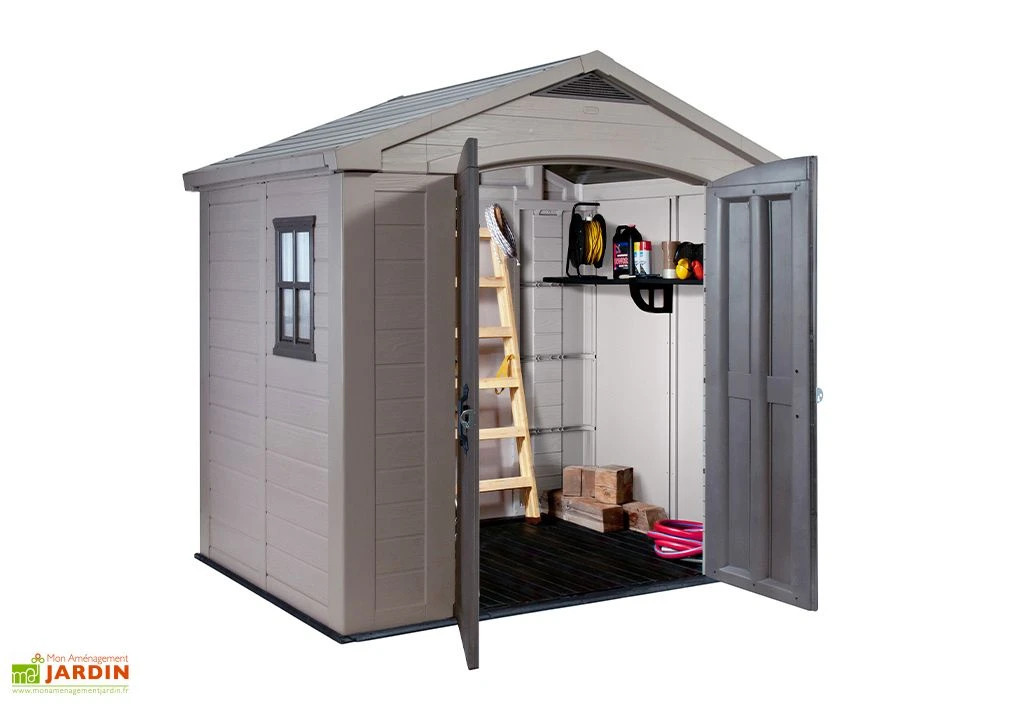 L’abri de jardin Sydney 86 de chez Keter est en polypropylène traité anti-ultraviolets. Ses dimensions hors tout sont : 256,5 x 182 x 243 cm. À l’intérieur se trouvent un puits de lumière ainsi que des étagères pour une meilleure organisation.