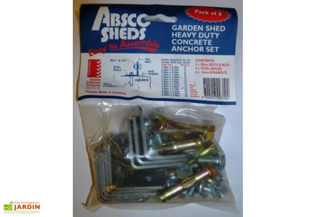 Votre kit d’ancrage pour abris de jardin en métal de la gamme des abris Absco consolidera durablement votre abri avec un kit conçu pour résister aux intempéries. Le kit est constitué de 8 équerres en aciers, 8 chevilles à visser Dynabot (10 mm) et 8 vis et écrous. Le kit d’ancrage se fixe sur la dalle en béton. Une notice détaillée vous explique comment réaliser l’installation sur votre dalle de béton. Chaque abri de jardin en métal Absco nécessite 2 ou trois kit d’encrage comme indiqué dans le tableau récapitulatif disponible dans vos photos. Le kit est disponible uniquement avec la livraison d’un abris Absco distribué par Madeira.
