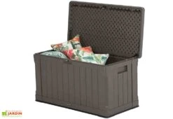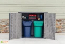 Très pratique, ce coffre de rangement extérieur est doté d’un couvercle monté sur vérins et d’une double porte frontale permettant de faciliter le stockage des objets relativement encombrants. Cette double porte lui permettra par ailleurs de faire office de cache-poubelles, ce dernier pouvant accueillir deux bennes. A noter également, la possibilité de verrouiller le couvercle ainsi que les portes afin de sécuriser le contenu du coffre (cadenas non inclus).